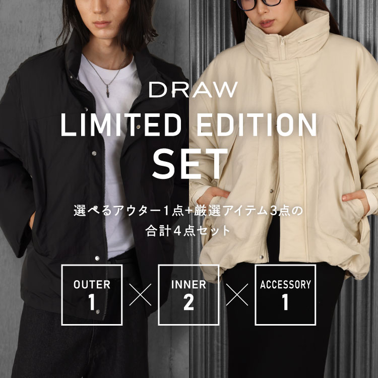 DRAWから選べるアウター入りの特別セットが登場。 アウター1点+インナー2点+ファッション雑貨1点、計4点の限定パッケージ。