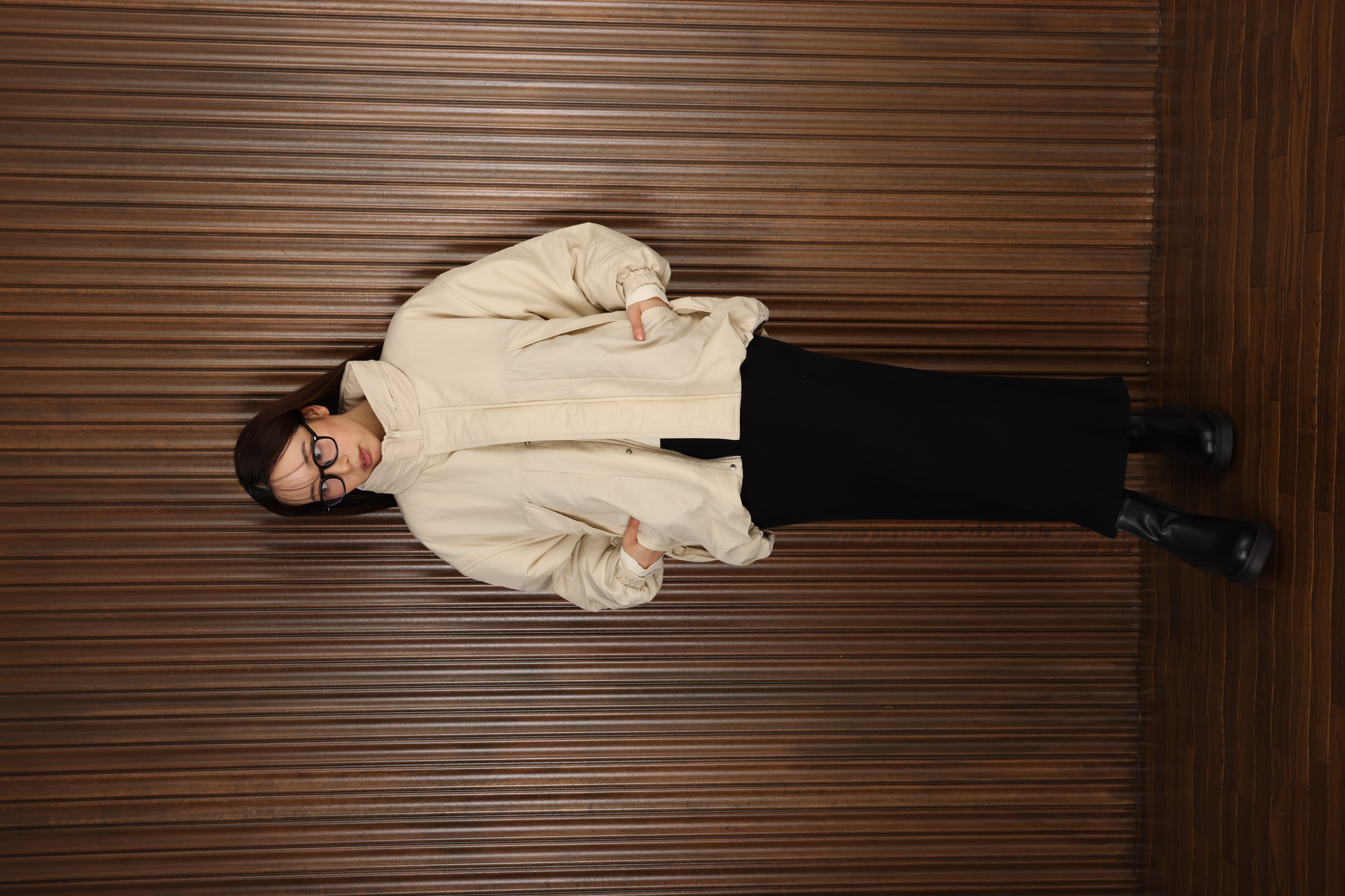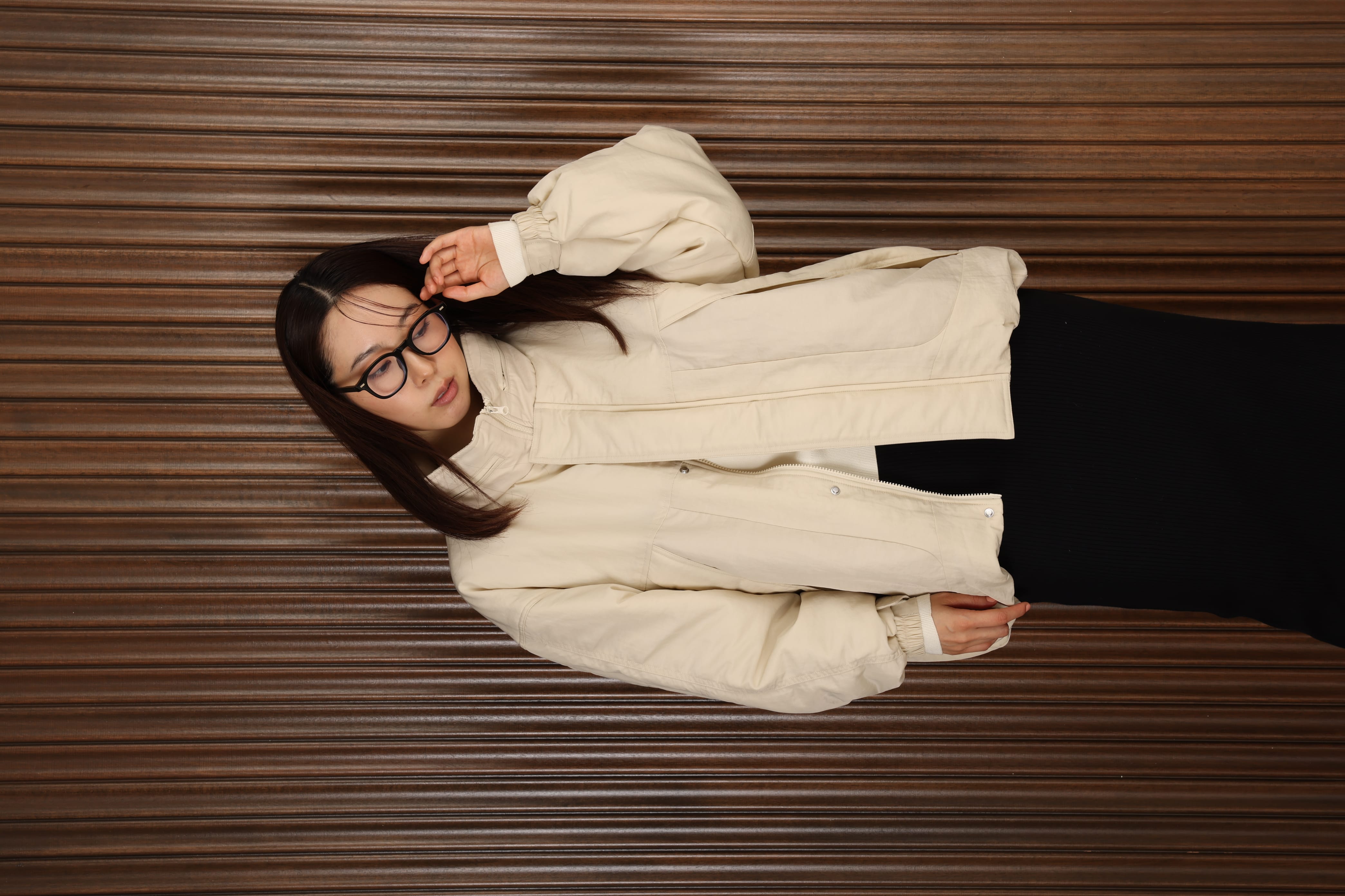 「静謐(せいひつ)な美しさが宿る、洗練された佇まい。余計なものを削ぎ落とし、細部まで計算されたシルエットが、気品と清潔感を纏わせる。控えめでありながら、凛とした存在感を放つ装い。