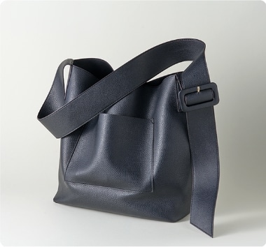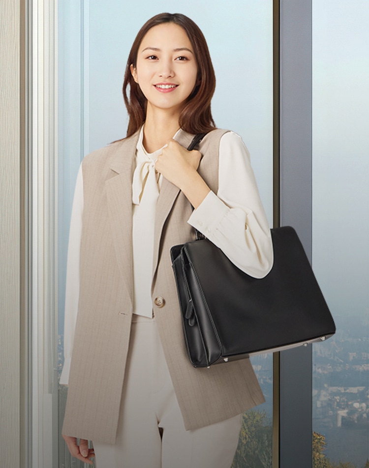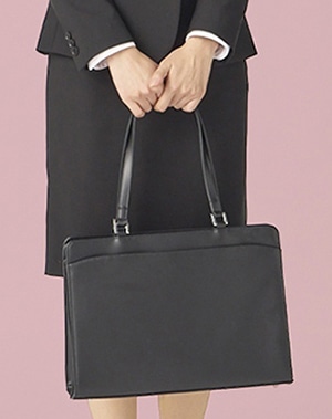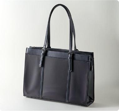 本革もしくはレザー風の黒で、装飾のないシンプルなものを。ほどよくスリムで肩がけできるタイプなら、両手も開くので安心!軽量でペットボトルやPCを入れる仕切りポケットがあるものが人気です。