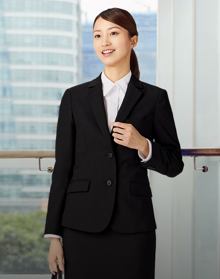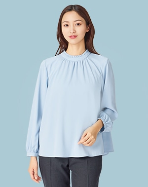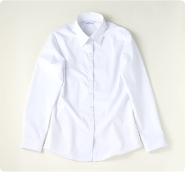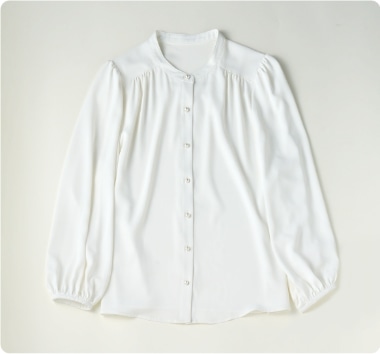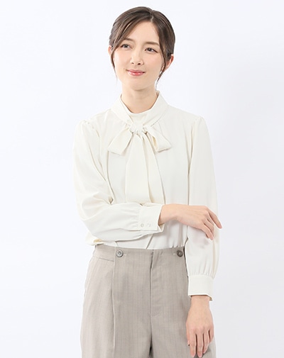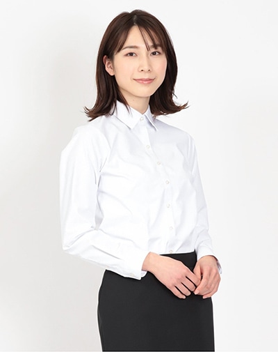 最初に選ぶべきは、衿がきれいに収まる定番タイプのブラウス。インナーが透けるような薄手の生地は避けシンプルなものを。肩から腕のラインがきれいに見える体型にあったサイズを選びましょう。