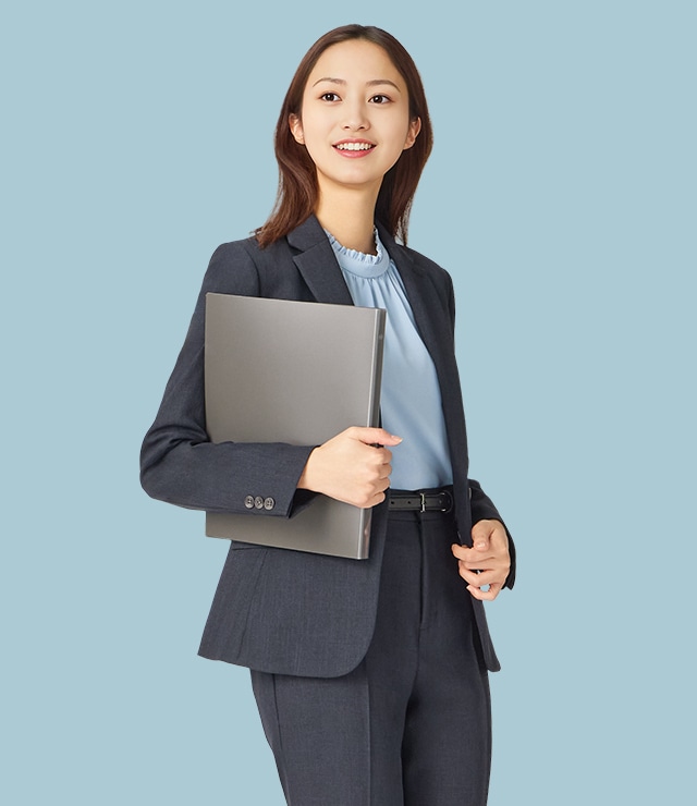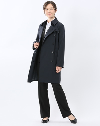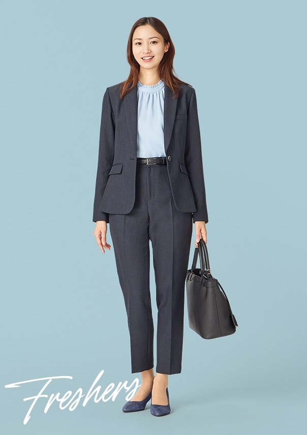 清潔感ときちんと感を兼ね備えたネイビースーツは、ウォッシャブル機能付きで、働き始めの毎日に心強い一着。インナーにはトーンを合わせ、肌ざわりがなめらかなサックスのブラウスをセレクト。防シワ&UVカット機能も嬉しいポイントです。