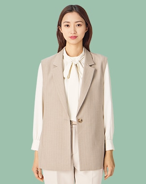 ジレとパンツを軸に、ブラウスを合わせた正統派のきれいめインターンコーデ。ライトトーンが表情をやわらかく見せ、明るい雰囲気に。動きの多いアクティブなシーンにも対応し、日常使いにも取り入れやすい着回し力で、社内から通学まで大活躍!