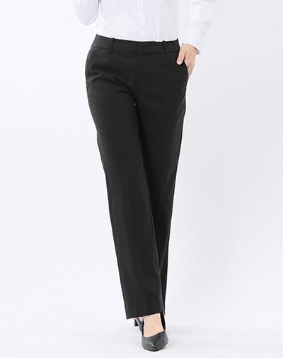 ストレートパンツはパンプスのヒールにかかるくらい がおすすめです。テーパードパンツはくるぶしにかかる 程度が綺麗に見えます。パンツの場合は必ずベルトを 着用しましょう。