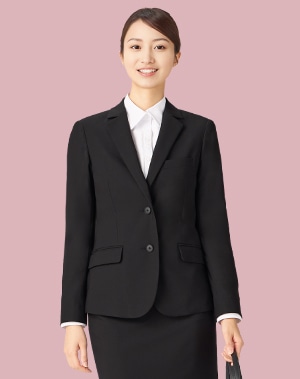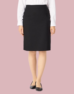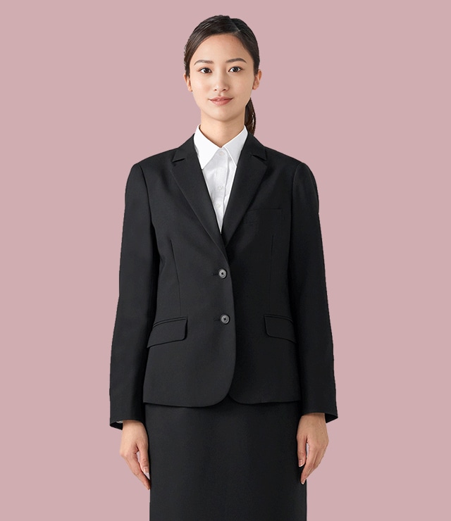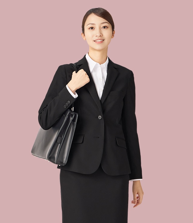 基本のブラックセットアップスーツ。超撥水防汚機能[CLEAR EFFECT]付きで、移動時に心配な雨や汚れにも対応。透け防止率93%の白ブラウスと合わせれば安心感があり、着席も立ち姿も上品なタイトスカートが、面接シーンに寄り添います。