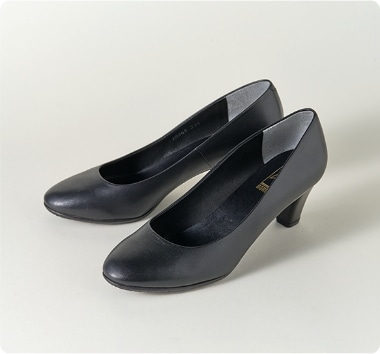 歩き回る就活生やフレッシャーズには、爪先の丸いプレーントゥが最適!本革もしくはレザー風の黒を選び、メンテナンスもこまめに行いましょう。3~5cm程度を目安に、ヒール部分も太めの方が足への負担も軽減します。