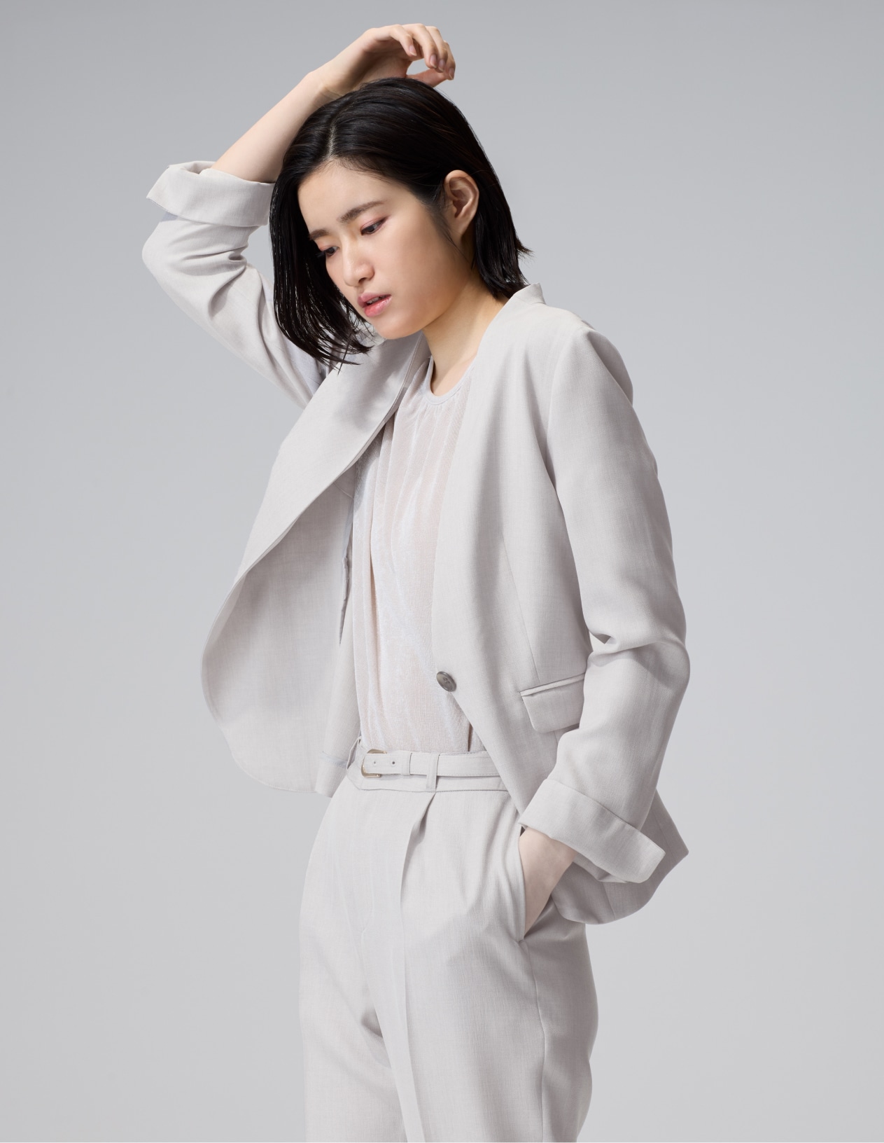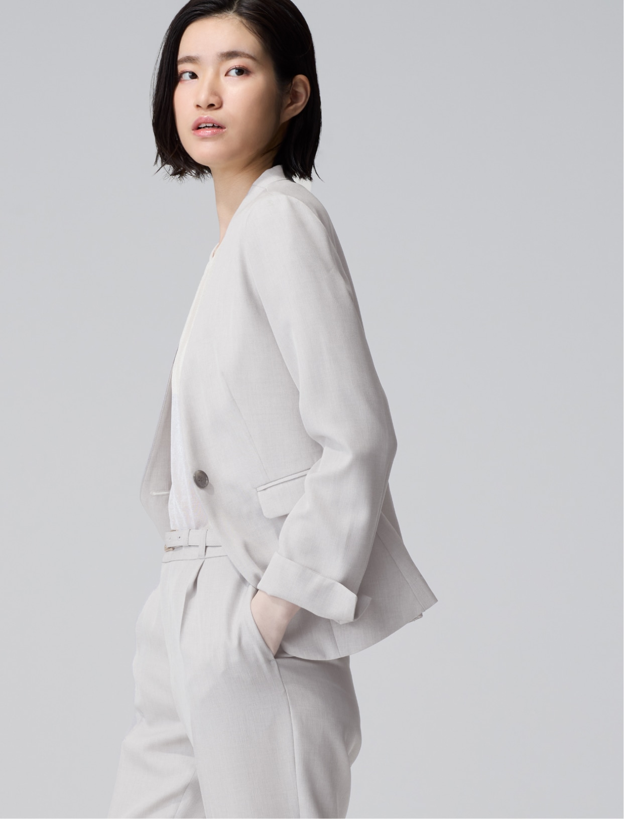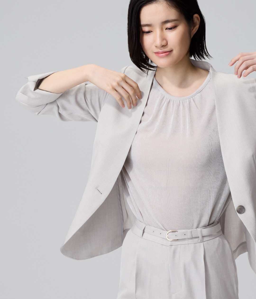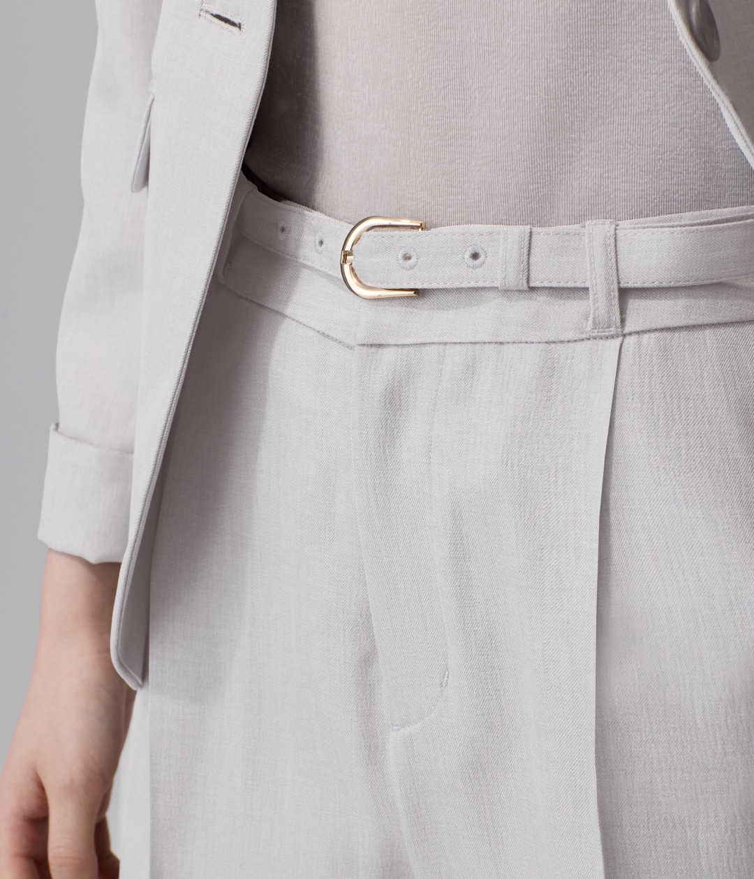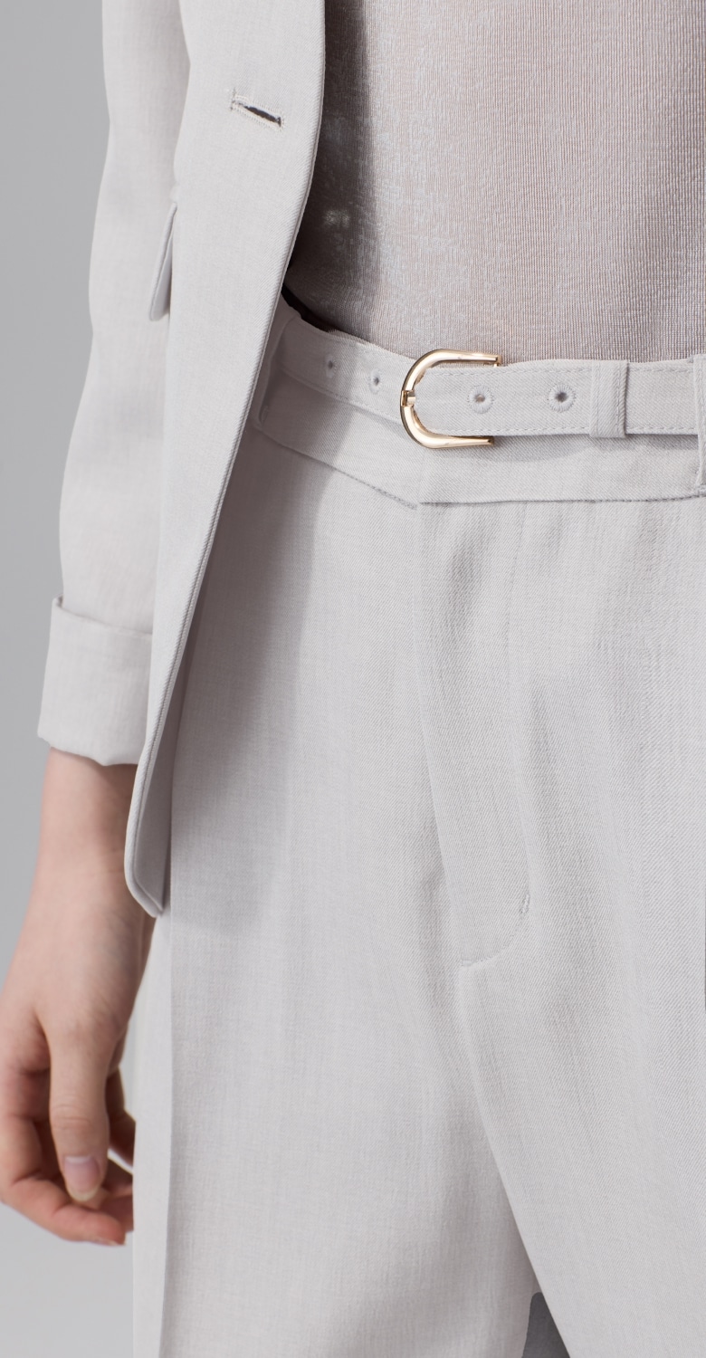 セットアップと同素材の細ベルトはミニマルで