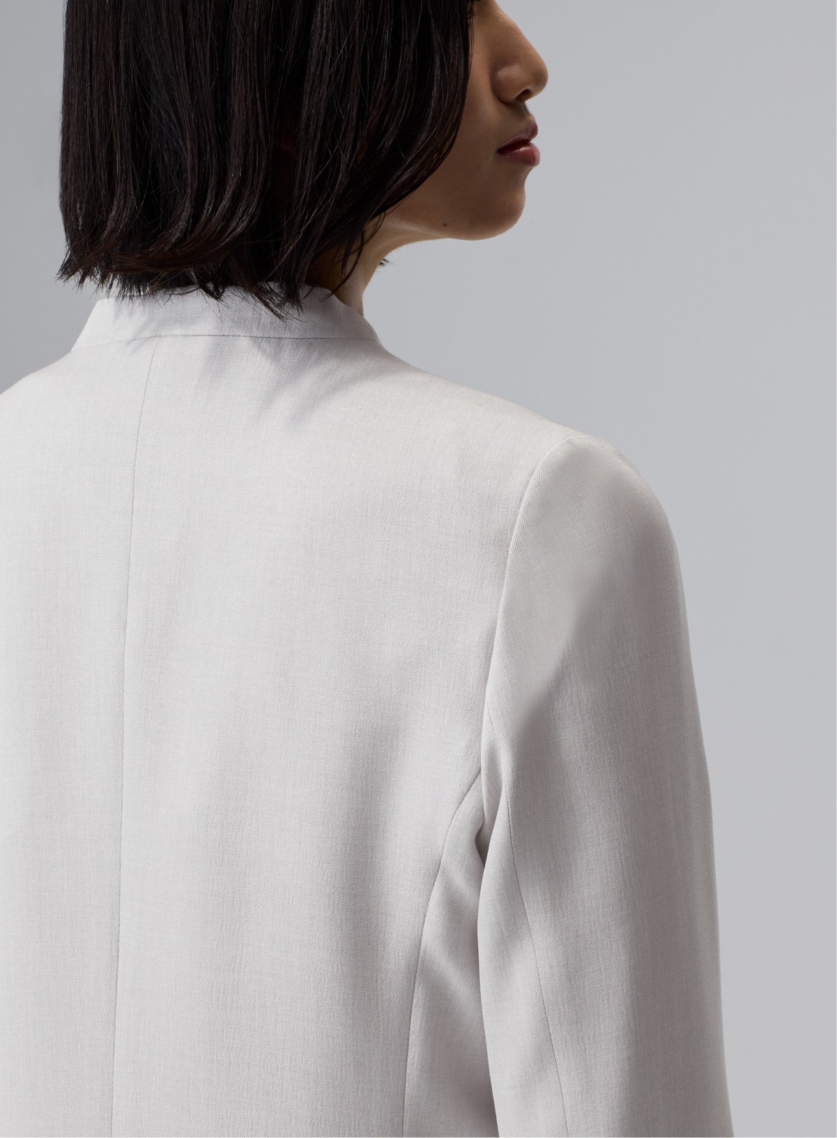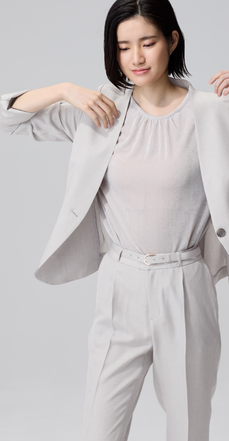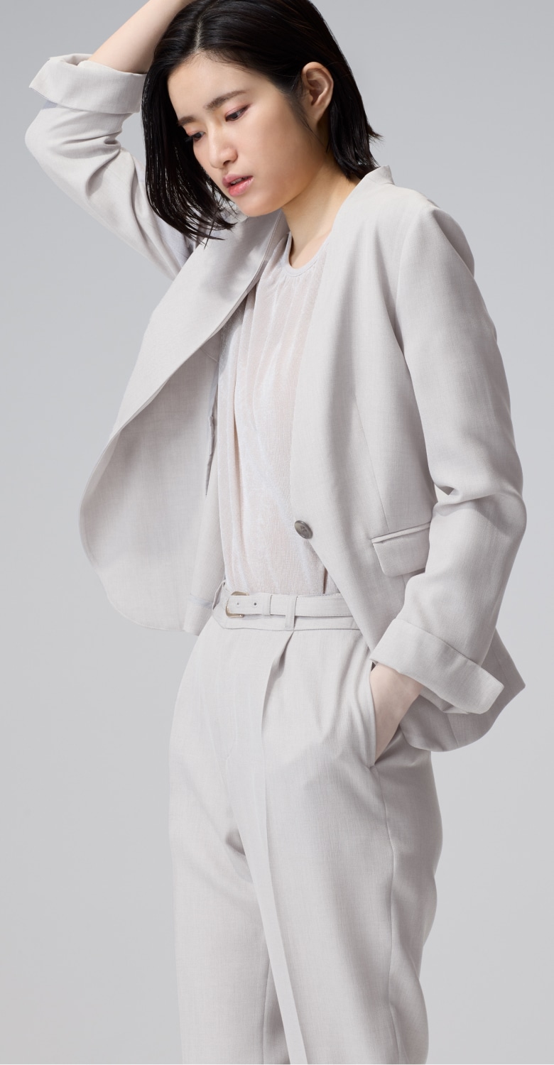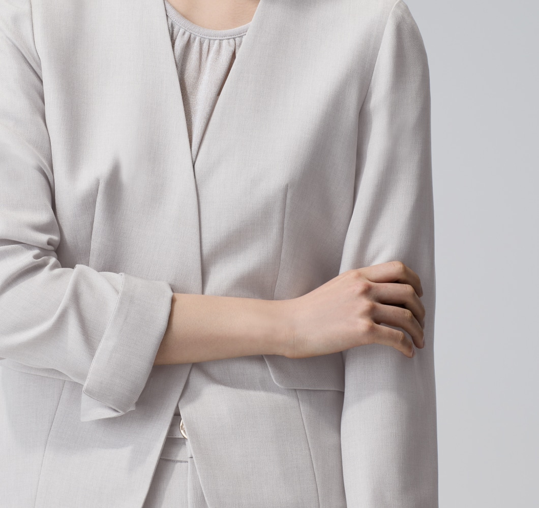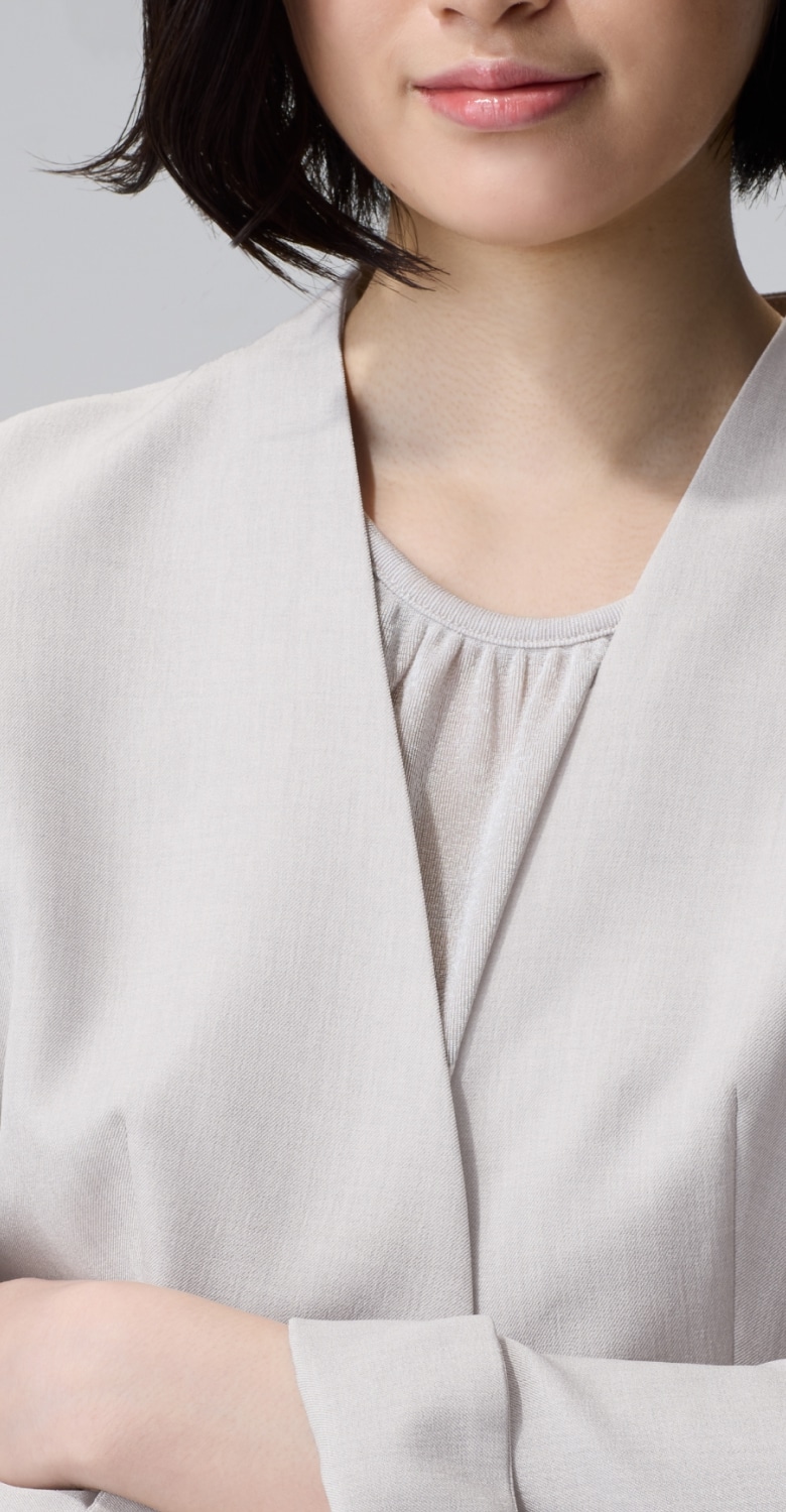 高級感のあるメランジ素材は、シンプルなノーカラーの