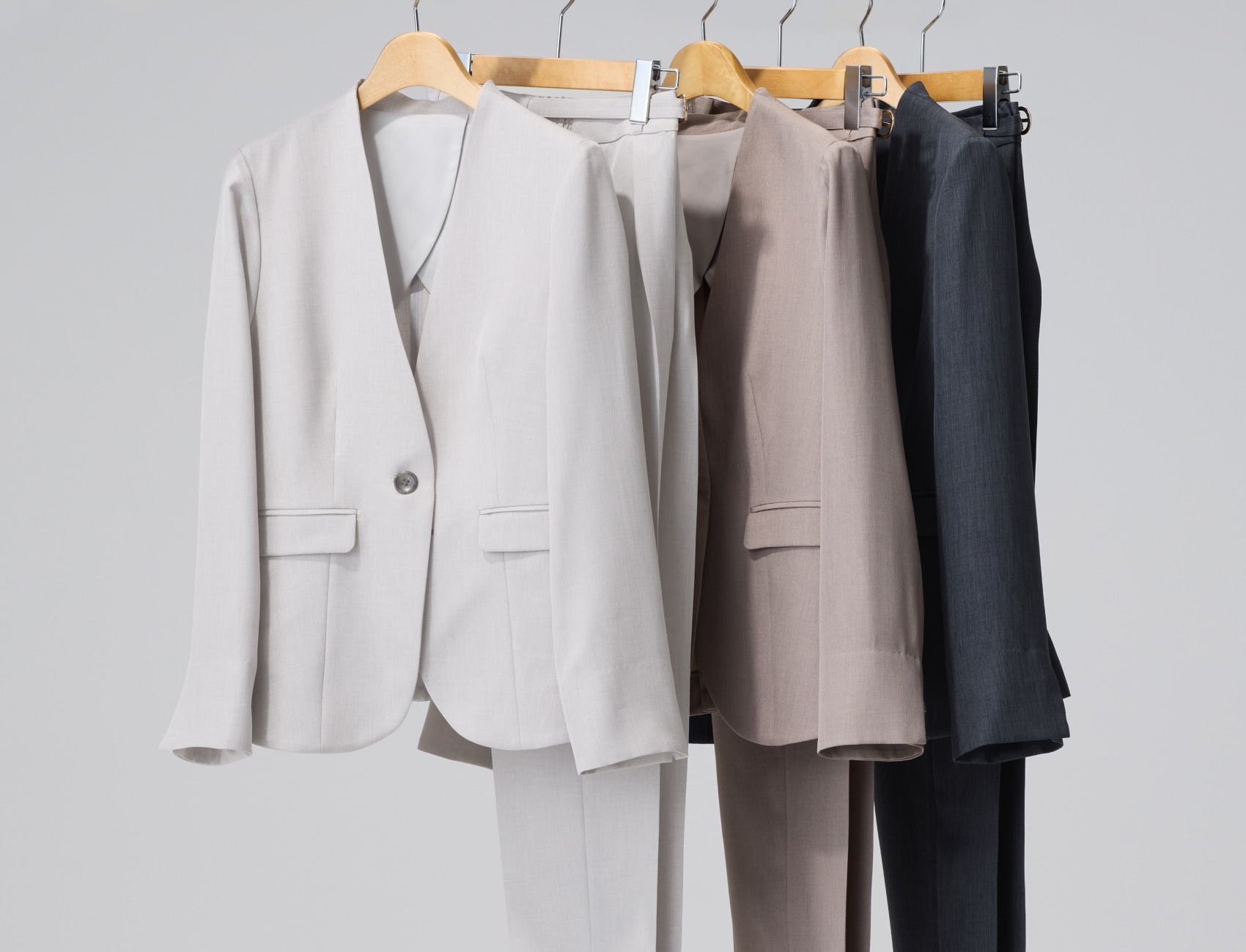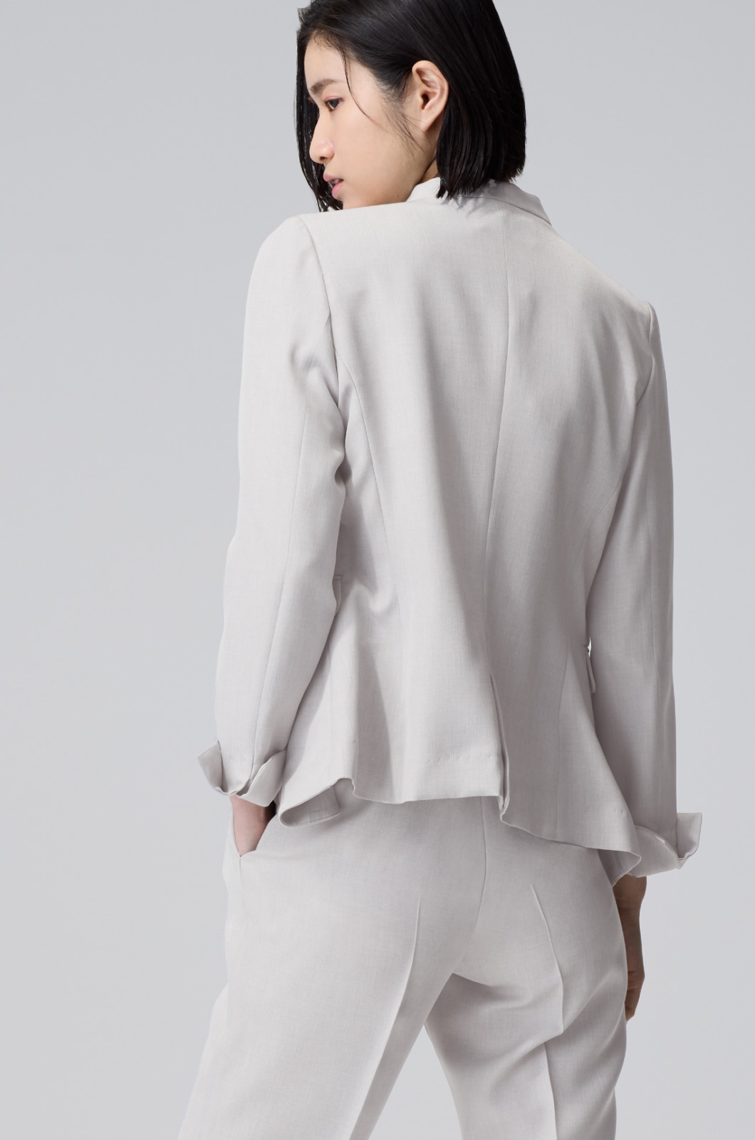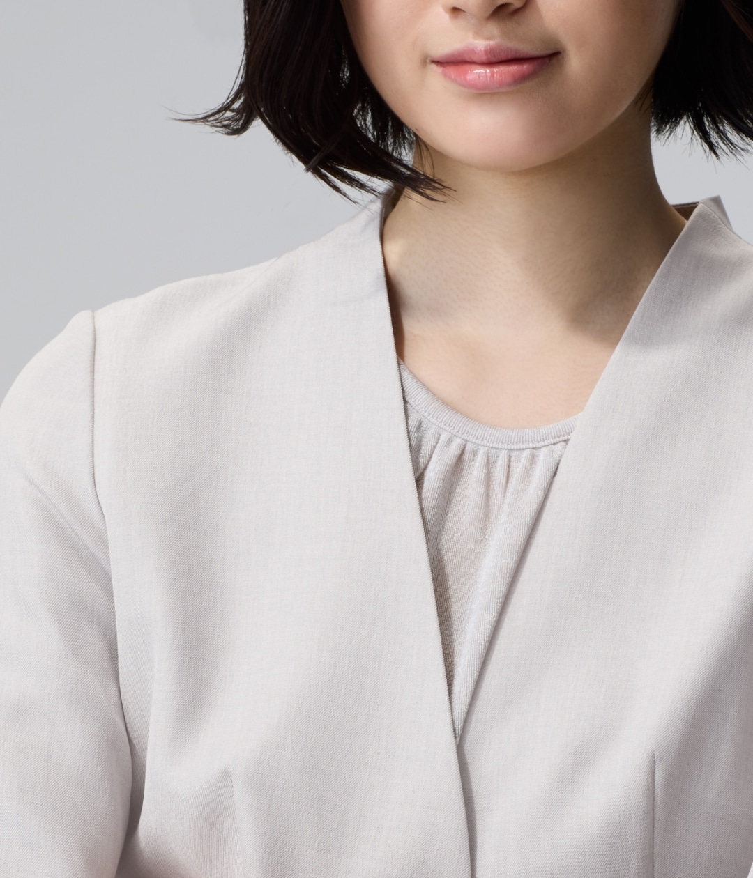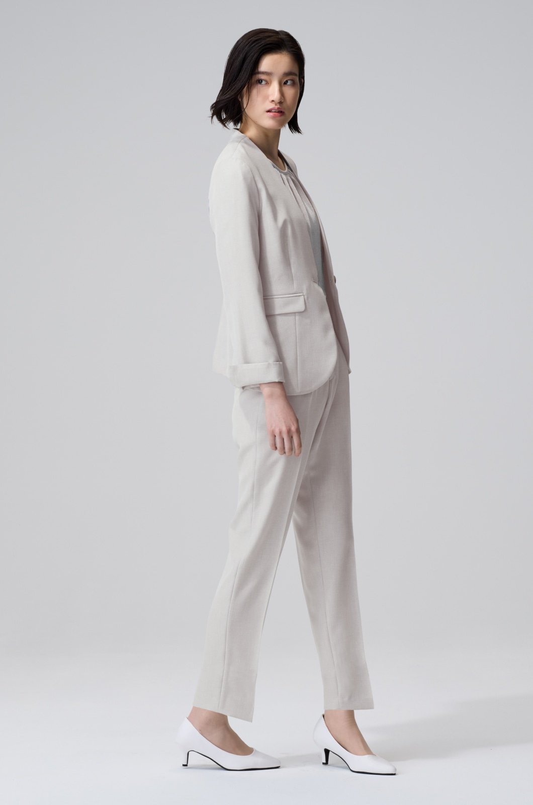 高級感のあるメランジ素材は、シンプルなノーカラーの